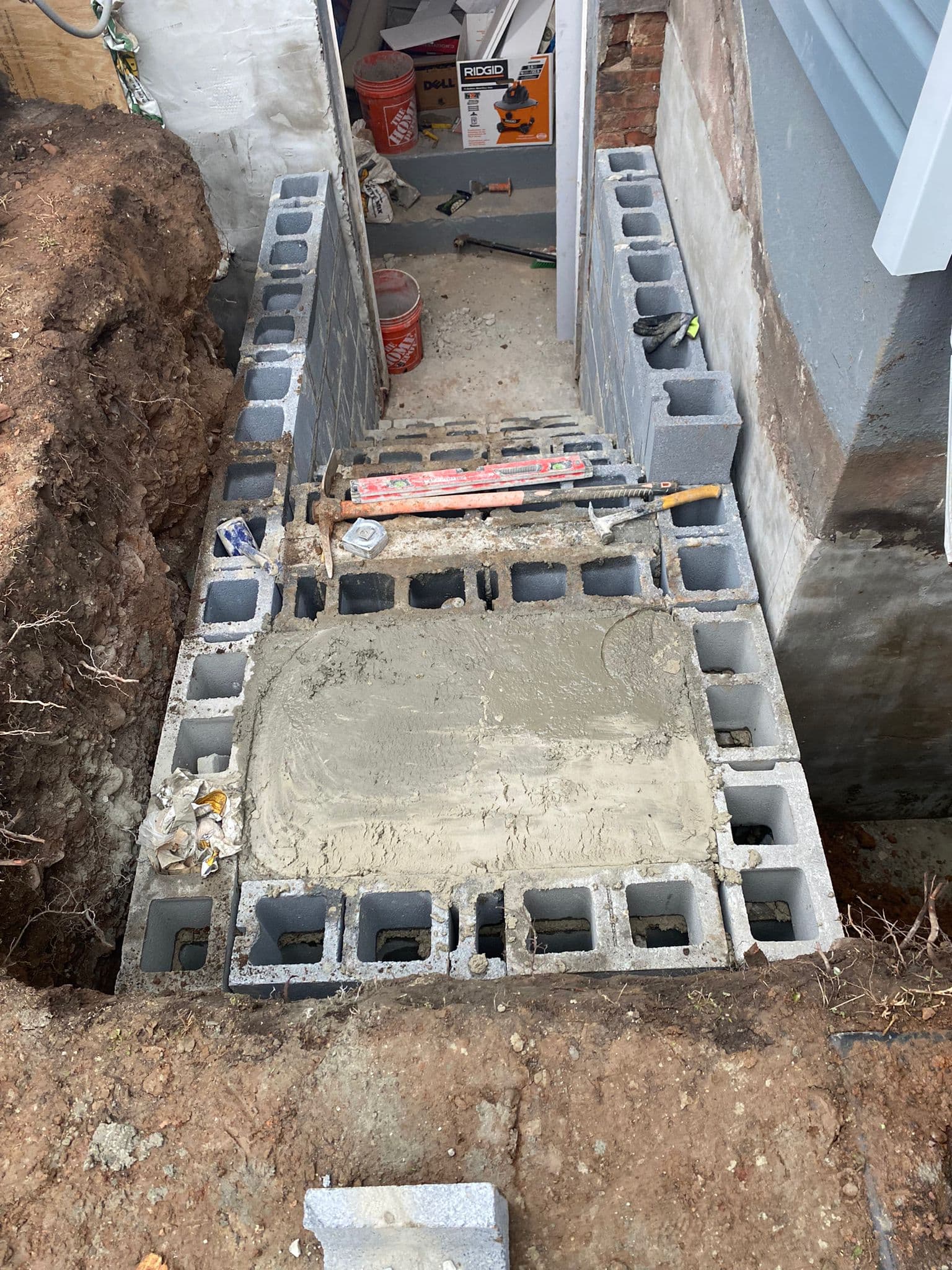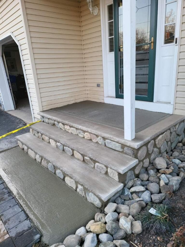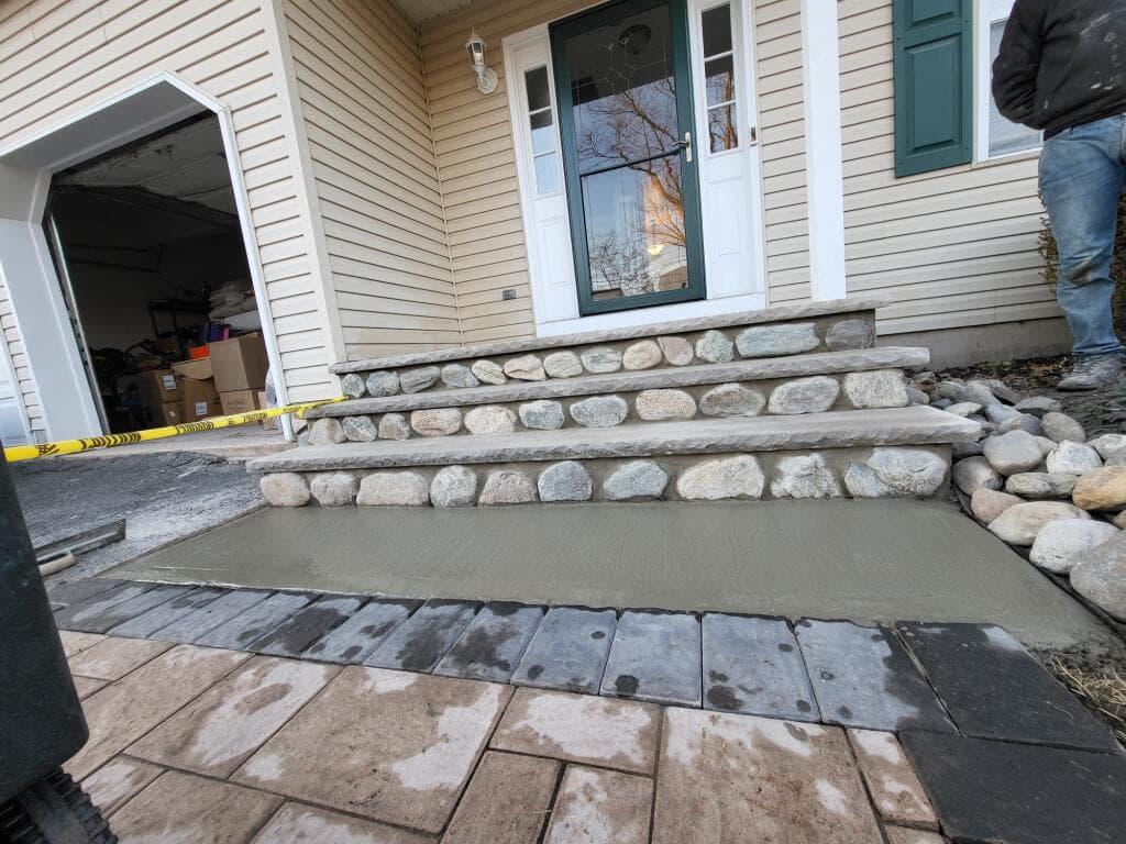 Custom construction of blue stone steps, granite treads, and brick veneer landings built on frost-proof, reinforced footings.